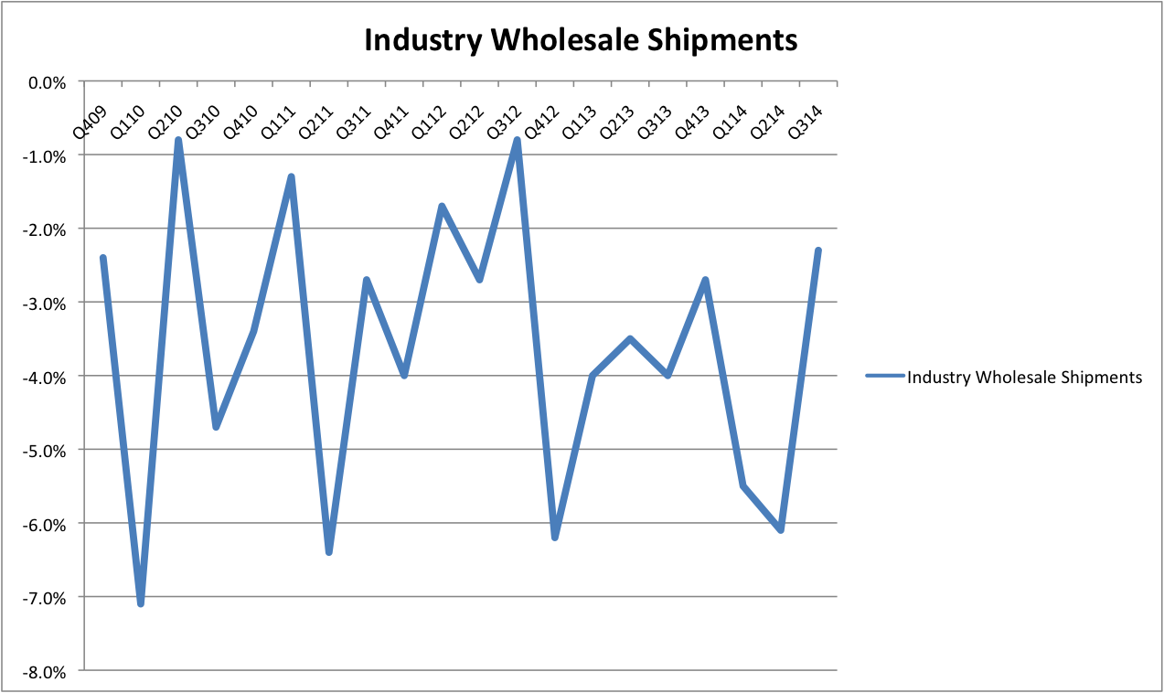 According to Management Science Associates, domestic cigarette shipments decreased 4.7% in 2013, more than double the 2.2% rate seen in 2012. Lorillard says industry wholesale shipments were down 2.3% last quarter.