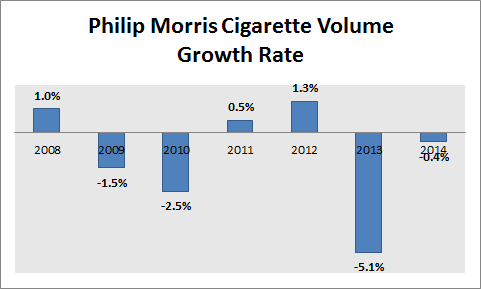 Cigarette volume is the biggest long-term headwind for Philip Morris' dividend. Even as the world population has continued to grow, higher taxes and tighter regulation constrained cigarette sales over the past decade. Philip Morris experienced its worst volume decline in 2013, when it sold 5.1% fewer sticks than in 2012.