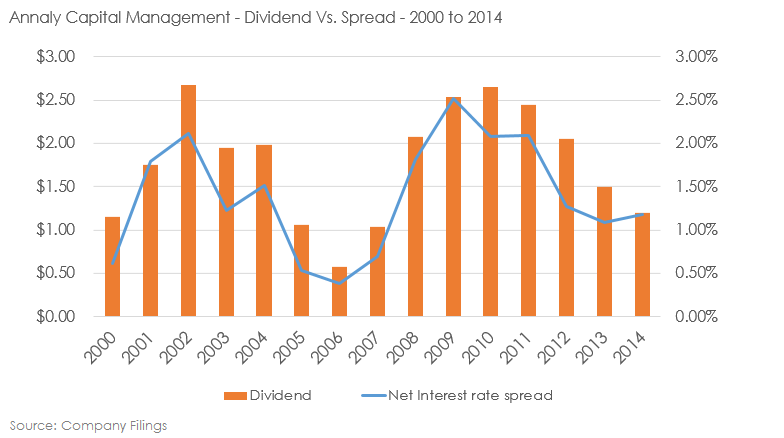 The blue line and the percentage on the right represent Annaly's net interest rate spread -- the difference between the interest rate on their borrowings and their assets. The orange bars are Annaly's annual dividend. The wider the spread, the bigger the company's dividend.