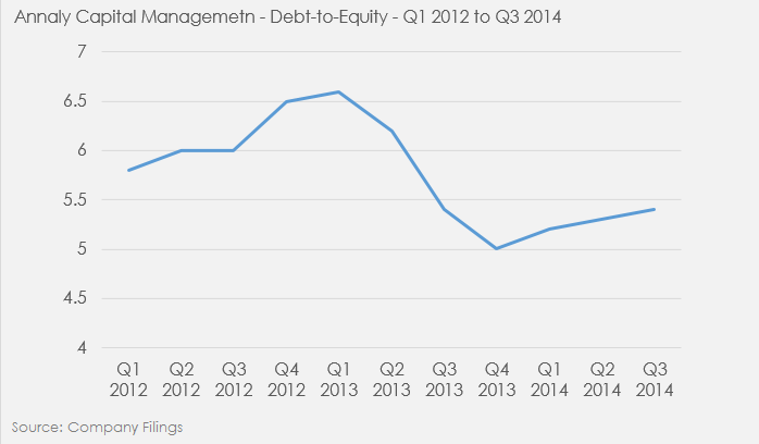 As of the third quarter of 2014, Annaly's leverage sits at 5.4 to 1. Considering the company has jacked this ratio up over 6.5 in the recent past, Annaly has plenty of wiggle room to up its use of debt, buy more securities, potentially create bigger returns, and increase its dividend.