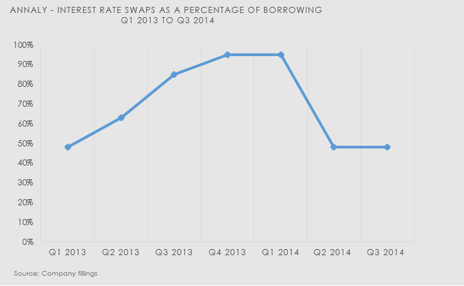 To address this issue Annaly uses, among other similar tools, interest rate swaps. Essentially, this allows Annaly to trade its floating interest rate payments for fixed rates. The good news is that Annaly's costs of funds are locked in and not as exposed to rising and falling rates. The bad news is that in exchange for the protection fixed rates provide, Annaly receives a higher interest rate, which makes borrowing more expensive.