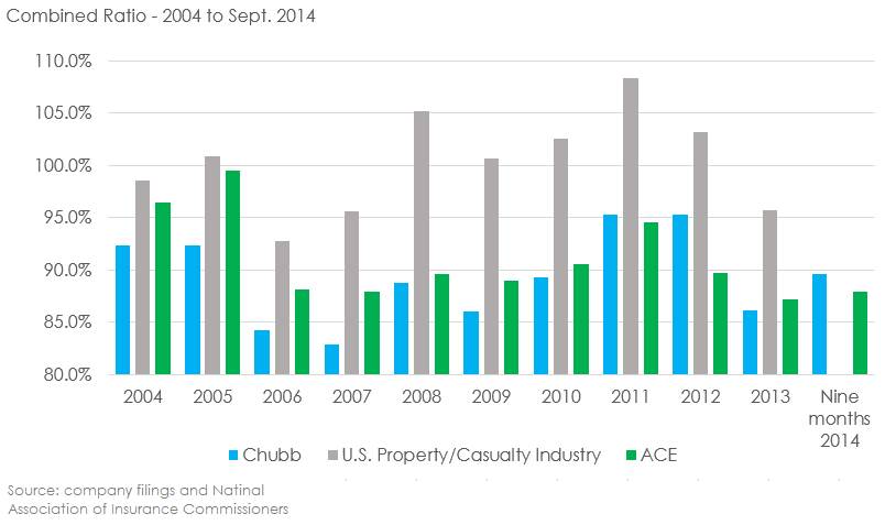 Like golf, the lower a company's combined ratio the better. Over 100%, however, means that a company's losing money. As you can see in the chart above, Chubb and ACE have consistently outperformed their industry peers.