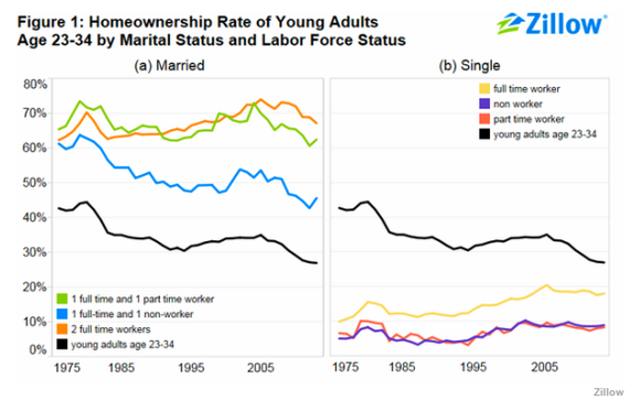 The black line in the chart below represents home ownership among young adults; as you can see, it's been trending downward.