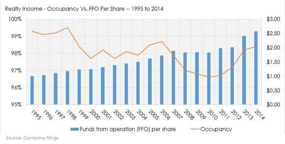 Throughout Realty Income's 46-year history it has kept occupancy above 96%, and they have steadily grown funds from operation, FFO, per share (a REIT earnings metric that adds depreciation and amortization expenses back into net income).