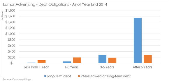 As you can see, the vast majority of Lamar Advertising's debt is due after five years, and with the company generating about $280 million in operating income in 2014 -- also called EBIT, or earnings before interest on debt and taxes -- it is earning about two-and-a-half times what it owes in debt in any one year over the next several years. This gives the company wiggle room if earnings fall.