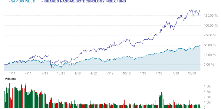 Over the last three years, this ETF has outperformed the S&P 500 by an impressive 80%. Better yet, these returns should continue well into the future. Looking at the top three holdings in this ETF, we find Gilead Sciences (GILD 1.90%) at 8.7% of the fund, Biogen Idec (BIIB +0.68%) at 8.6%, and Celgene (CELG +0.00%) composing 8.1% of the total holdings.