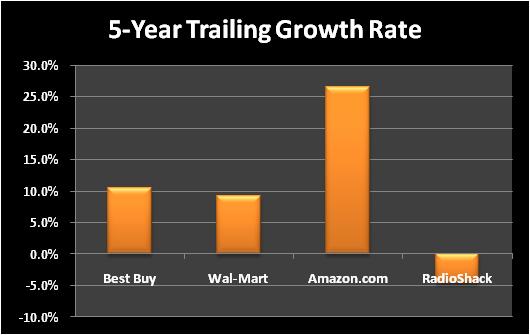 Here's how Best Buy compares with its peers for trailing five-year growth: