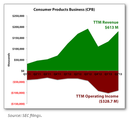 NVIDIA has since changed its tone and Huang recently confirmed Tegra guidance this year in the ballpark of $540 million. A year ago, Huang said he had already invested $2 billion in Tegra and that total has certainly climbed higher by now. This is how the broader CPB segment has performed over the past couple years.