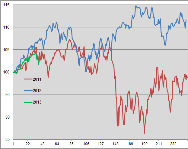 In that regard, it sometimes appears that we're stuck in a kind of "Groundhog Day" scenario, where fits of optimism and a run of positive indicators perpetually alternate with bad numbers and investor worries. The following graph shows the performance of the S&P 500 for 2011 (red line), 2012 (blue line) and 2013 (year to date, green line). All have been rebased to a starting value of 100.