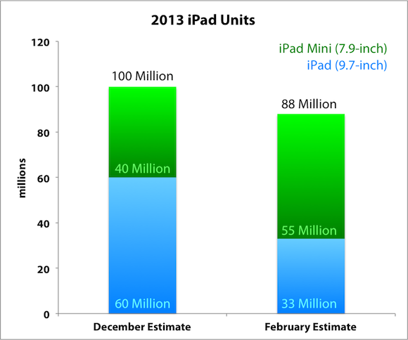 In December, the researcher estimated that Apple was planning to ship 100 million total iPad units in 2013, a figure that's now been reduced to 88 million units. Since DisplaySearch keeps its fingers on the broader display industry's pulse, this estimate may be more meaningful than reported order activity at any single supplier.