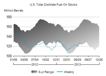 Distillates supplies, which include diesel and heating oil, increased 0.5 million barrels, wiping clean last week's 0.5 million barrel decrease. Distillates demand is up a seasonally adjusted 11.1% over the last four weeks, and supplies remain "near the lower limit of the average range for this time of year," according to the EIA.