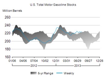 Gasoline inventories increased a near-negligible 0.1 million barrels after expanding 0.8 million barrels the week before. Demand for motor gasoline is up a seasonally adjusted 3.3% over the last four weeks, and supplies remain "above the upper limit of the average range."