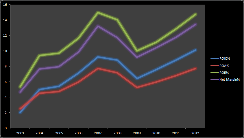 Further proof that Disney spends its money wisely can be found by looking at its consistently improving return on equity, assets, and margins -- which show management is able to turn cash spent into strong earnings.