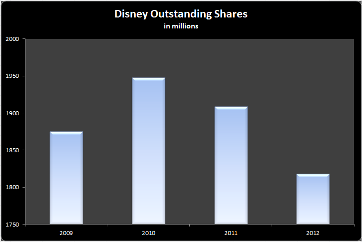 When Disney isn't spending money on smart acquisitions or expanding its products, it finds other ways ways to reward shareholders. Disney increased its annual dividend by 25% to $0.75 a share last December for a yield of about 1.16%. Disney has also unleashed its buyback program over the last few years, and it recently announced an extension to its share repurchase program to the tune of another 400 million shares. The program has significantly reduced the number of shares outstanding.