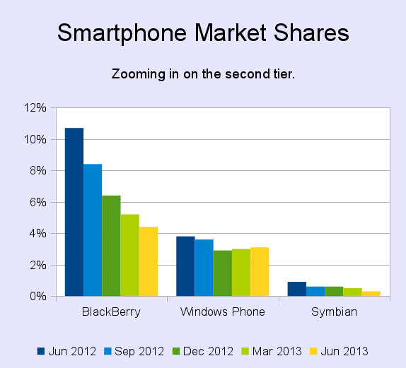 In summary, Apple seems to pick up whatever market share BlackBerry is losing. Everything else stays more or less flat. Windows Phone seems destined to become the third-largest smartphone platform in a couple of quarters, but only because BlackBerry can't stop its freefall.