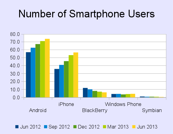 The story is particularly dark for BlackBerry. Its share of the American market has dwindled from 10.7% to just 4.4% in 12 months. That's despite launching the brand-new BB10 platform and a number of fresh handsets in 2013. Former CrackBerry addicts are still hanging up on the old favorite in huge numbers.