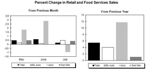 Retail and food services sales increased 0.2%, to $424.5 billion, for July, according to a Commerce Department report (link opens as PDF) released today.