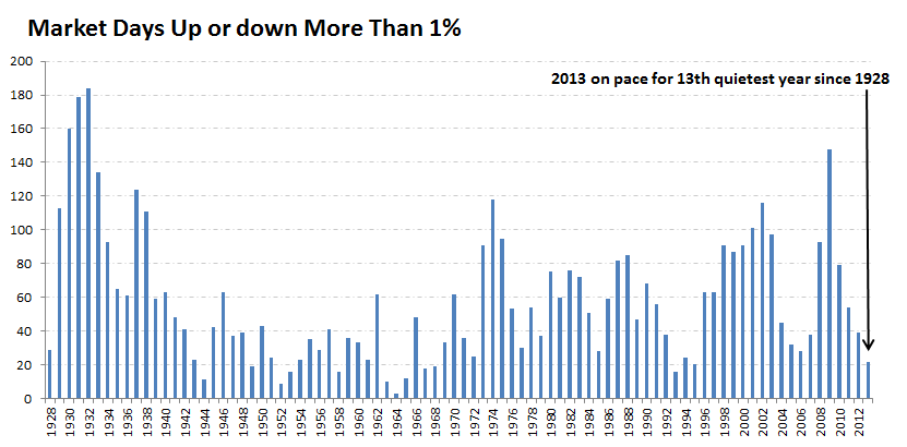Measured by the number of days the Dow has closed up or down more than 1%, 2013 is on track to be the least volatile year since 1995, and the 13th least volatile since 1928: