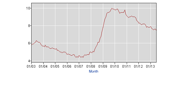 The other reality of the jobs picture is that it's still more than twice as hard to get a job now as it was roughly five years ago. Since May 2008 the average duration of unemployment has more than doubled from a seasonally adjusted 16.6 weeks to 36.6 weeks as of July 2013. The reduction in the unemployment rate seems to owe largely to people being forced into part-time work or simply becoming so discouraged that they drop out of the labor force altogether or go back to school.
