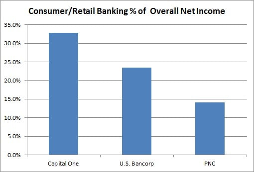 While Capital One is often considered to be less of a bank than its peers PNC and US Bancorp, consumer banking contributed more to its bottom line at nearly 33% than PNC (PNC 0.37%) (14%) and US Bancorp (22%) in the most recent quarter.