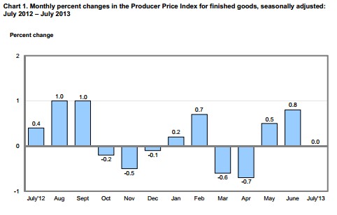 The Producer Price Index for finished goods was unchanged, seasonally adjusted, for July, according to a Labor Department report (link opens a PDF) released today.