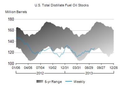 Distillates supplies, which include diesel and heating oil, expanded 2 million barrels for the second week of increases. Distillates demand over the past four weeks is up a seasonally adjusted 8.1% over the same period last year, and supplies are "near the lower limit of the average range for this time of year," according to the EIA.