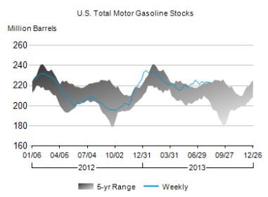 Gasoline inventories decreased by 1.2 million barrels (0.5%) after bumping up a slight 100,000 barrels the week before. Demand for motor gasoline over the past four weeks is up a seasonally adjusted 2.6% over the same period last year, and supplies remain "near the upper limit of the average range."