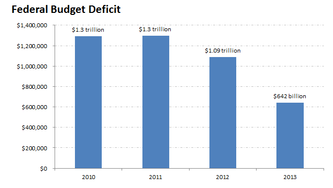 So, good news: Annual budget deficits are plunging, falling by half in the last three years: