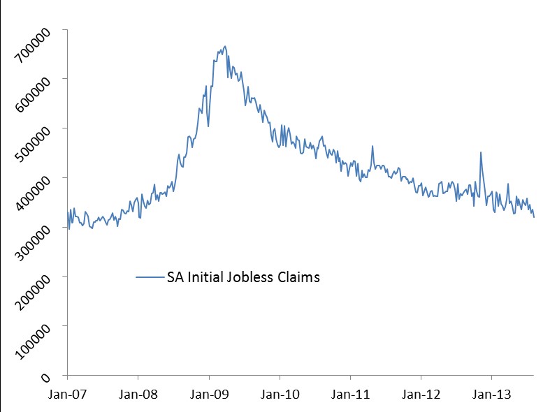 At the depth of the recession in March 2009, weekly applications for unemployment benefits numbered 670,000. They have fallen steadily ever since.