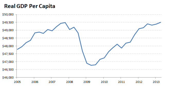 As of the second quarter, real GDP per capita -- how much the economy produces per person, adjusted for inflation -- is back at an all-time high: