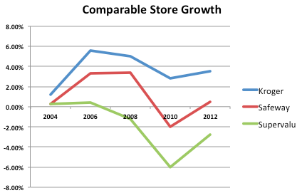 Again, we have two important trends showing up here. First, SUPERVALU started out with the best margins of the bunch but quickly fell off and is now in negative territory. Combined with lower sales per square foot than the competition, this should raise a red flag for investors.