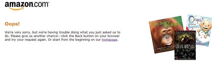 Yesterday, both Amazon.com's (AMZN 1.78%) main page and corresponding mobile site went offline for 30 to 40 minutes, leaving millions of frazzled Internet shoppers to frantically click the homepage link contained in the mildly amusing error message below.