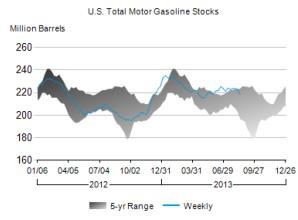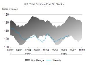 Distillates supplies, which include diesel and heating oil, made for the only increase this week, up 0.9 million barrels for the third consecutive week of inventory expansion. Distillates demand is up a seasonally adjusted 2.8% for the last four-week period, compared to the year-ago period, and supplies are "near the lower limit of the average range for this time of year," according to the EIA.
