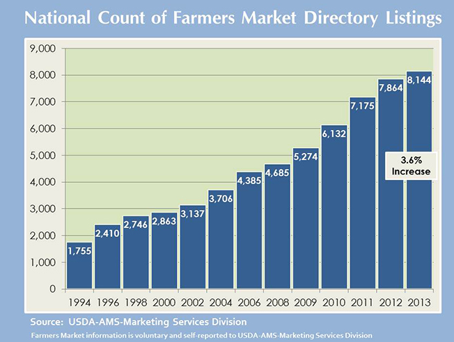 Between 1994 and today, the number of registered farmers markets has increased by 8% per year. And even though the past year showed much slower growth, this number doesn't represent the number of vendors attending specific farmers markets, which can increase dramatically over time.