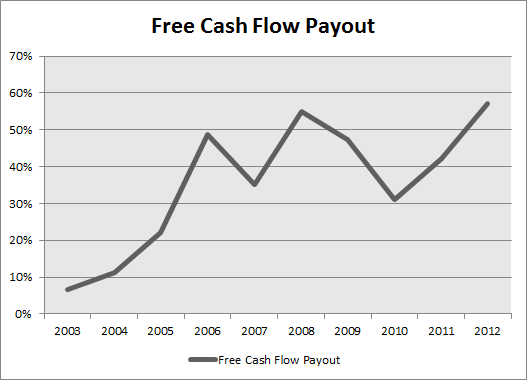 The chart shows that for the year 2012, Intel's dividend payout as a percentage of its FCF was at a historic high of 57%, much higher than the management's stated objective of 40%. Looking at this chart in perspective of Intel's dividend history, you can see that dividend increases come only when the FCF payout is close to or below management's stated target of 40%.
