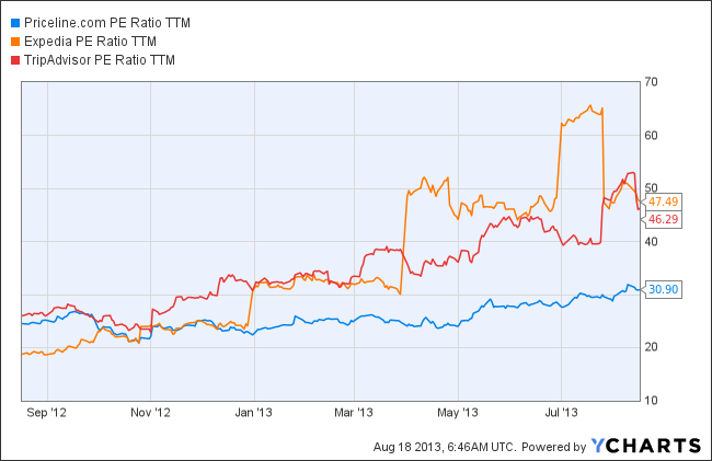 Priceline's price-to-earnings ratio of 30.9 could seem high for a company facing strong competition from meta-search engines in a cyclical market. But when compared against TripAdvisor (TRIP 1.43%) (47.5) or Expedia (NASDAQ: EXPE) (46.3), Priceline actually seems to be attractively valued at the moment.