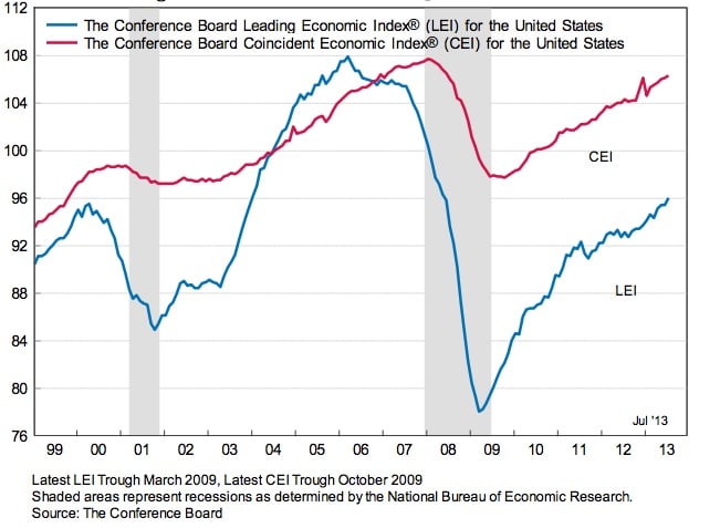 The third economic release was the Conference Board's latest Leading Economic Indicators index, which increased by 0.6% to 96. Ken Goldstein, an economist for the Conference Board, said: "The improvement in the LEI, and pick up in the six month growth rate, suggest better economic and job growth in the second half of 2013. However, the biggest uncertainties remain the pace of business spending and the impact of slower global growth on U.S. exports."