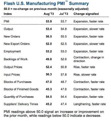 Unemployment claims are trending well below last year's average of 360,000 to 370,000. While that's a good sign, companies will need to significantly ramp up their hiring in order to put a dent in the unemployment rate. Today's second economic release was Markit's flash Purchasing Managers' Index, which showed that business conditions in the manufacturing sector improved at a faster rate in August than in July.