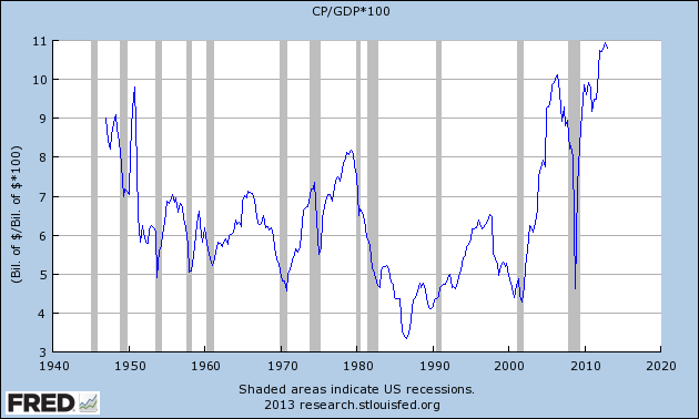 The one thing that can be said in favor of current equity prices, on the other hand, is that corporate earnings are increasing. As the following chart shows, corporate profits have climbed to around 11% of gross domestic product, far and away the highest level ever.