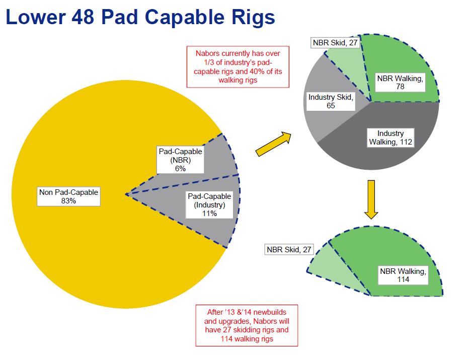 These higher-technology rigs also command a 20% price premium, but the problem today is that rig companies simply have too many legacy rigs on their books that drag on earnings. So for the next couple years, rig companies' bottom lines will suffer as they turn over their assets. This trend will slow as pad-capable rigs become a larger part of the overall fleet.