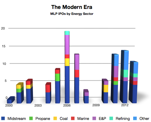 What's interesting is that over the last three years we've watched energy companies that have not attempted to find success with the MLP business structure all of a sudden give it a go. The "other" category first appeared in 2011, and since then we've watch frac sand producers, petrochemical companies, and offshore drillers throw their hats in the ring. We've also watched several refiners join the fray as well.