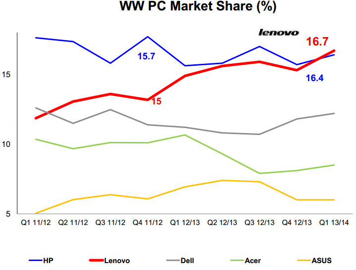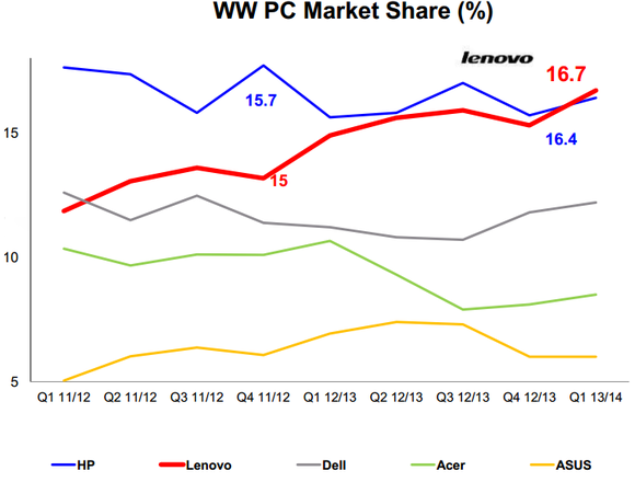 Despite poor desktop PC sales for the quarter, Lenovo has outperformed the PC market for 17 consecutive quarters and topped HP and Dell to become the world's largest PC vendor. The company's PC market share for the first fiscal quarter came in at 16.7% on shipments of 12.6 million units, according to research firms Gartner and IDC.