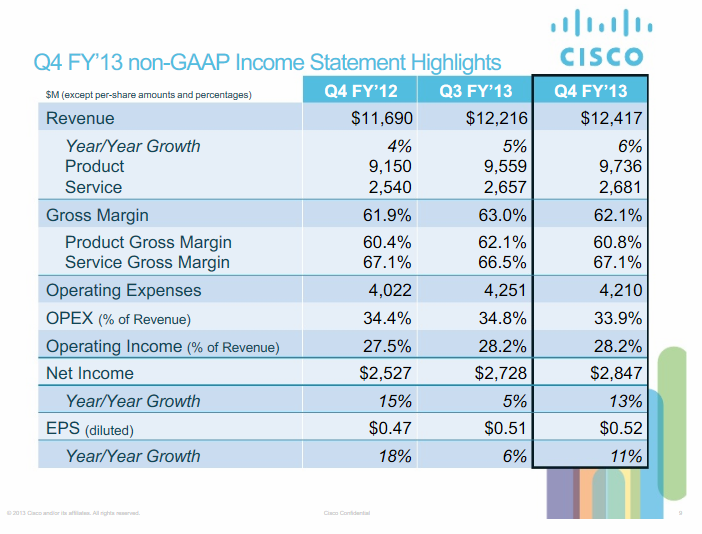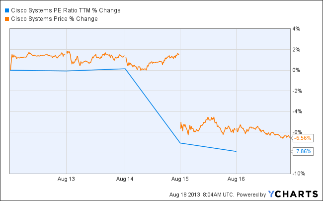 These results were strong enough to beat analyst estimates. However, probably because CEO John Chambers guided for 3%-5% revenue growth next quarter, the stock plummeted.