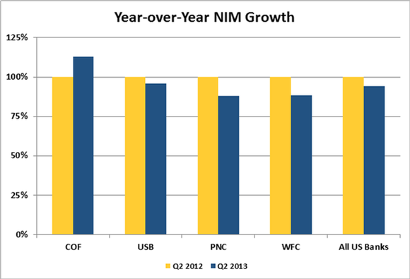 While we know it's not apples-to-apples to compare Capital One's NIM to those of the peers because of the differences in loan types, it might help us see how those numbers have grown over the last year: