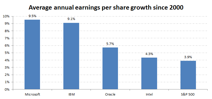 The truth is that while Microsoft stock has been a dud, Microsoft the company has done quite well. Take a metric a CEO has more accountability over than share price: Earnings per share. Since Ballmer took over in 2000, Microsoft has grown earnings per share by 9.5% per year, compared with 3.9% for the broader S&P 500. Next to other established large-cap tech companies, Microsoft's results under Ballmer have been excellent: