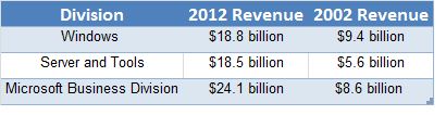Take revenues at Microsoft's three core divisions: Windows, Microsoft Business, and Servers and Tools over the last decade: