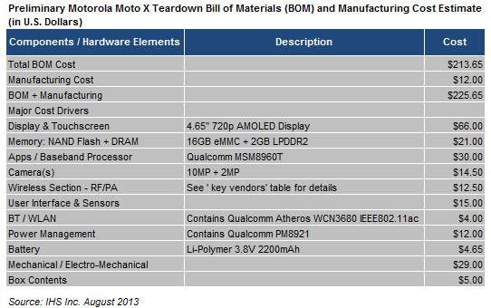 In its report, IHS says that after tearing down the Moto X, the preliminary total BOM is just $214, which combined with $12 in manufacturing costs, gives the smartphone a total cost to produce of $226, smack in the middle between Apple's iPhone 5 at $207 and Samsung's Galaxy S4 at $237.