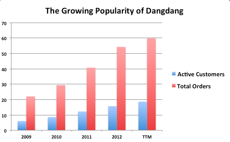 As you can see below, since 2009, Dangdang has been able to grow active customers by 38% and total orders by 33% per year.
