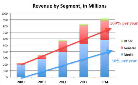 The company breaks down revenue into three categories: media (think e-books), general merchandise (stuff that's actually sent to your doorstep), and other (usually fulfillment services for third-party vendors). Over the last three-and-a-half years, revenue has jumped 51% per year!