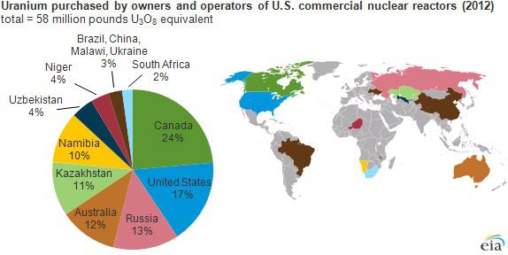And unfortunately for the United States, uranium isn't always American. A new report published by the Energy Information Administration shows that just 17% of the uranium purchased by U.S. nuclear owners and operators came from within our own borders. Canada's contribution clocks in at 24%, but things get trickier from there. If you think nuclear spells energy independence, try spelling Russia, Kazakhstan, Namibia, Uzbekistan, and Niger .